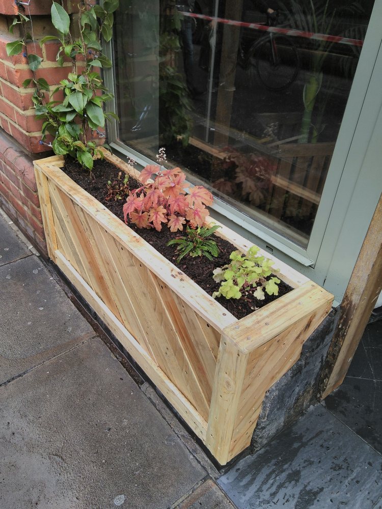 The Hide Bar wanted some planters to make their street facing windows more attractive. They approached the team at Lend and Tend who do all sorts of excellent work like this. They realised that purpose made planters would be needed here since the window was such an unusual shape and so they contacted me. The upcycled pallet wood seemed a good choice, since it has a lovely varied texture and the herringbone design has a strong sense of movement about it and is quite striking.