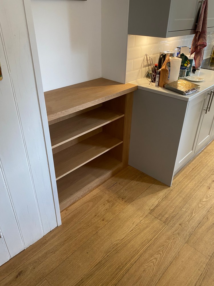 Here are some examples of my work, from small shelving units to fully fitted kitchens, each designed with careful attention to detail and functionality. I take pride in creating customized solutions that not only meet the specific needs of my clients but also enhance the overall aesthetic of their homes. Whether it’s maximizing storage in a compact area or designing a kitchen that becomes the heart of the home, my work reflects a blend of creativity and practicality.